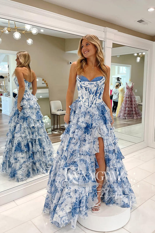 Princess A-Line Strapless Evening Gown Blue Floral Printed Chiffon Long Prom Dress with Slit LF1359