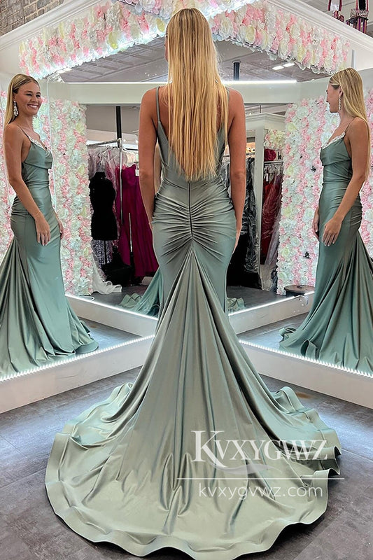 Green Mermaid Sweep Train Ruched Satin Prom Dress with Slit LF253