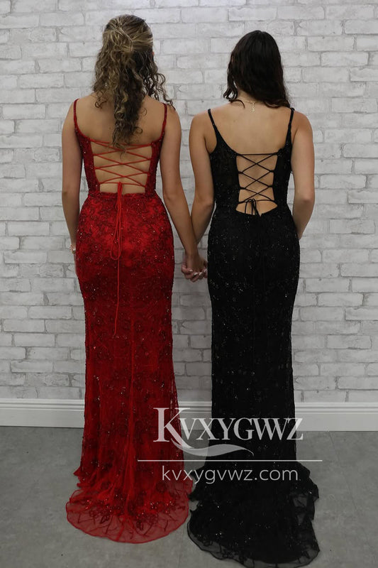 Mermaid V Neck Red Evening Gown Sequin Lace Long Prom Dress with Slit LF1387