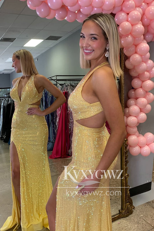 Mermaid Halter Evening Gown Yellow Beads Long Prom Dress with Slit LF1394