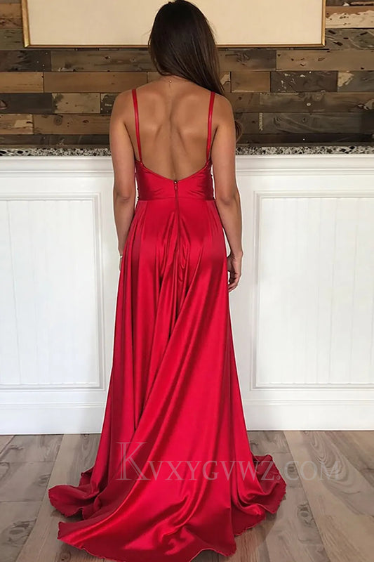 Elegant Red Spaghetti Straps Satin Long Prom Dress with Slit LF243