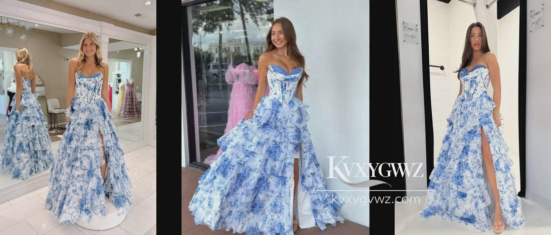 White Blue/Pink Flower Tiered Sweetheart Corset High Split Long Prom Dress LF001