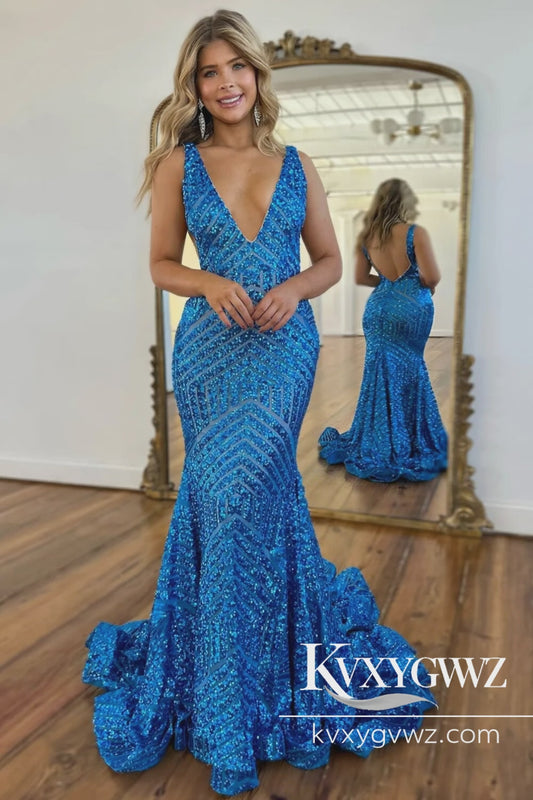 Light Purple Deep V Neck Sequin Mermaid Prom Dress LF018