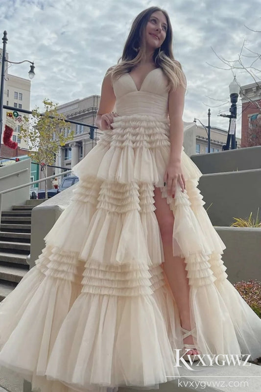 Beige Tulle Tiered Spaghetti Straps Long Prom Dress with Slit LF007