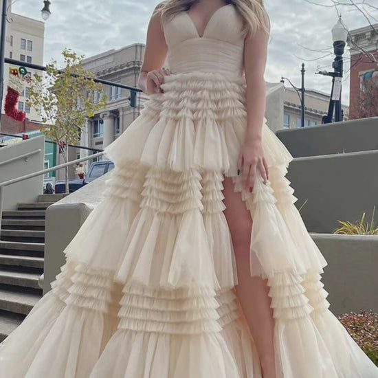A romantic, mood-board-ready evening gown featuring a plunging V-neck and slim spaghetti straps that lead into a dramatic tiered tulle “cake” skirt. Light, layered construction gives a floaty, editorial silhouette ideal for black-tie galas, prom night, or a show-stopping wedding-guest look. Pin this if you’re curating soft-romantic, couture-inspired formalwear with maximal volume and dreamy movement.