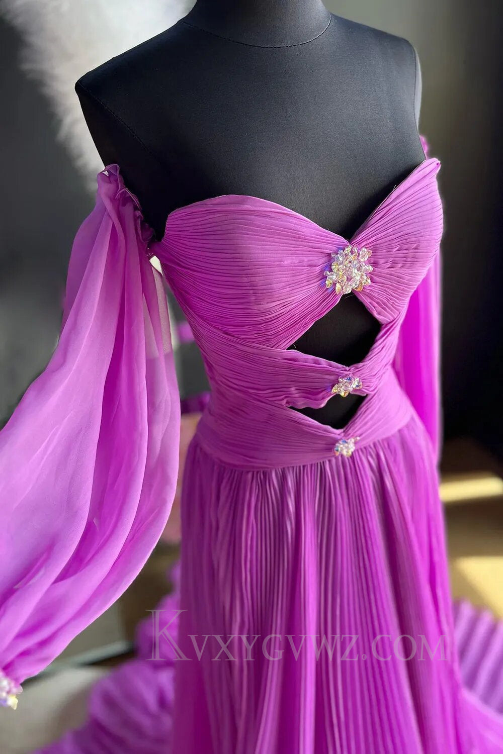 Blue Detachable Sleeves Cut-Out Long Prom Dress with Beading LF156