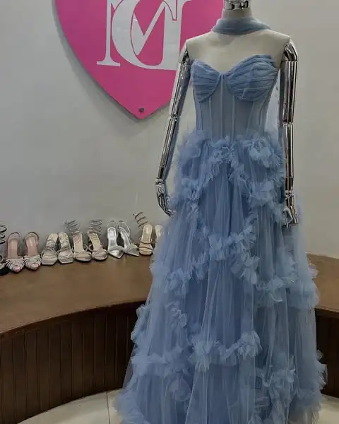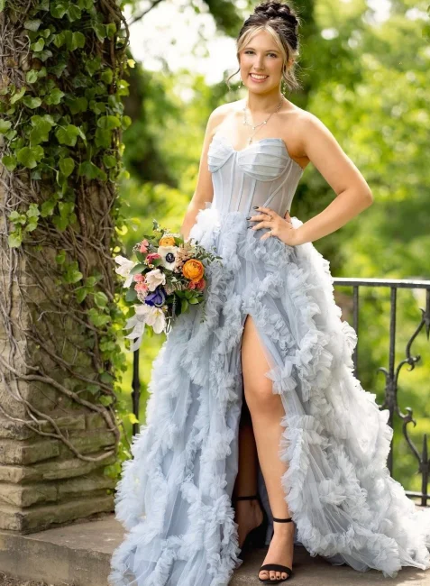 This elegant blue A-line prom dress features a strapless neckline and delicate ruffle detailing throughout. Made from light tulle fabric, it offers a graceful silhouette, complete with a thigh-high slit that adds a touch of allure. Perfect for making a statement at prom or formal events.