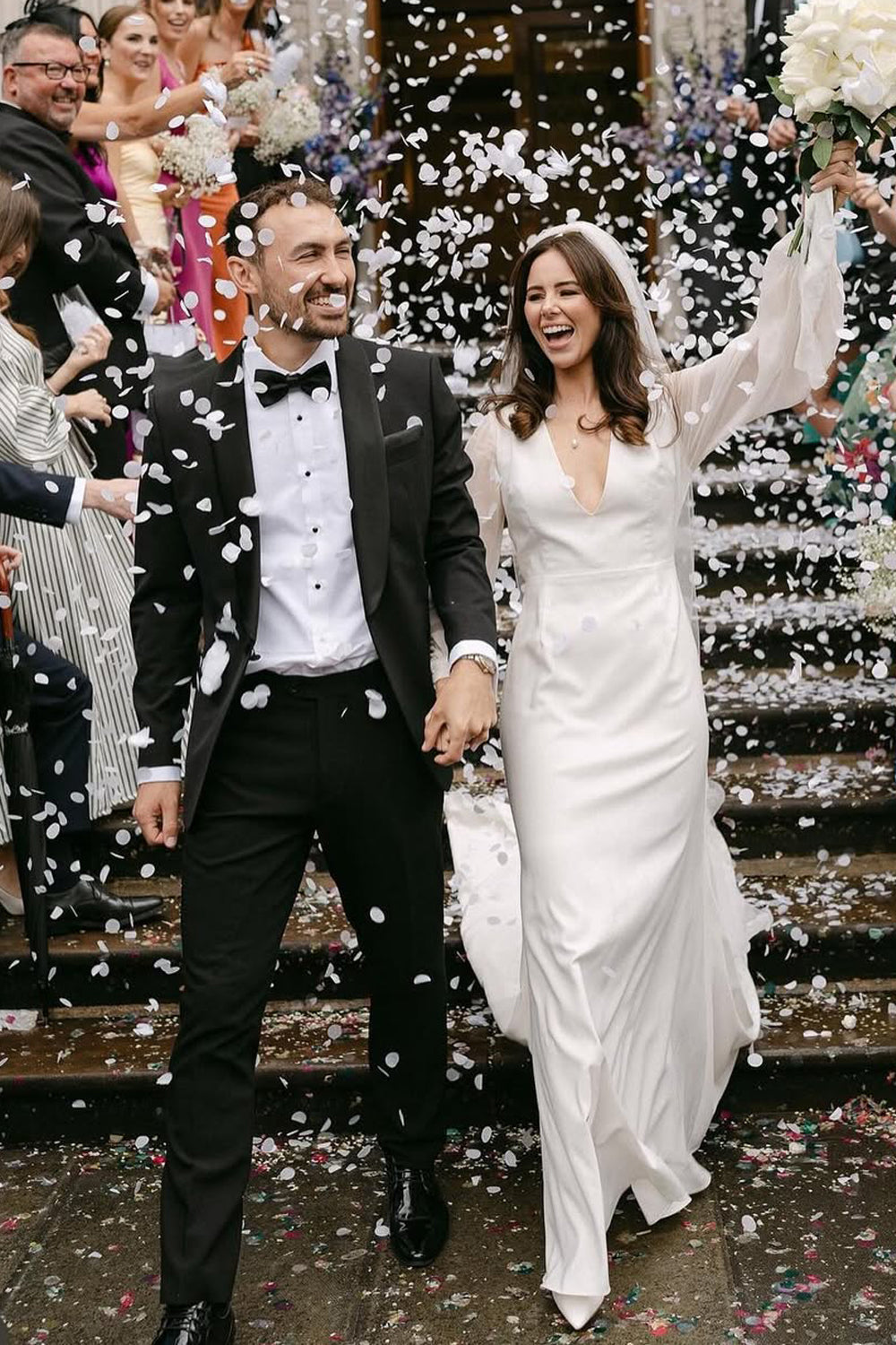Chic Mermaid V Neck Satin Wedding Dresses Gown with Long Sleeves HS892