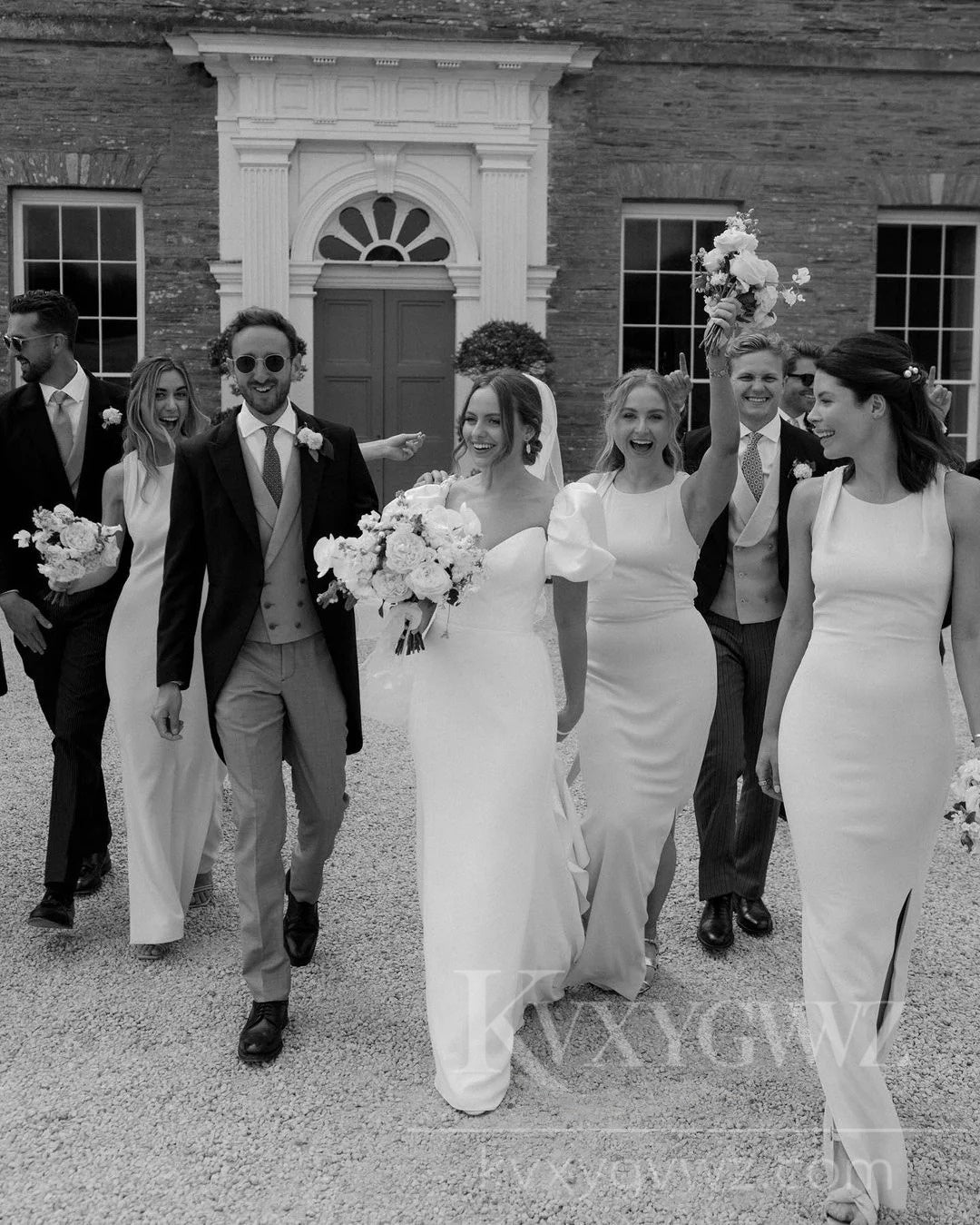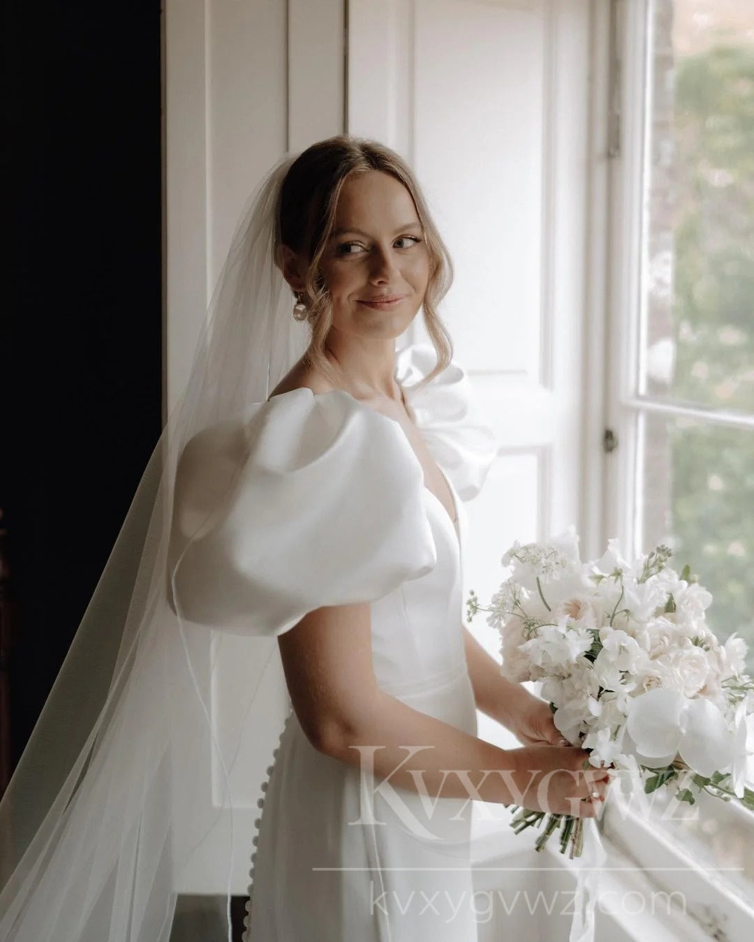 Step into your wedding day with elegance and charm in this satin V-neck wedding dress. Featuring voluminous puff sleeves and a flattering A-line silhouette, this gown beautifully blends classic bridal elements with contemporary style. The soft satin fabric adds a luxurious touch, while the dramatic sleeves and flowing train elevate the overall design. Perfect for a romantic countryside wedding or an intimate celebration, this dress is ideal for brides looking for a chic, modern look with a vintage flair."