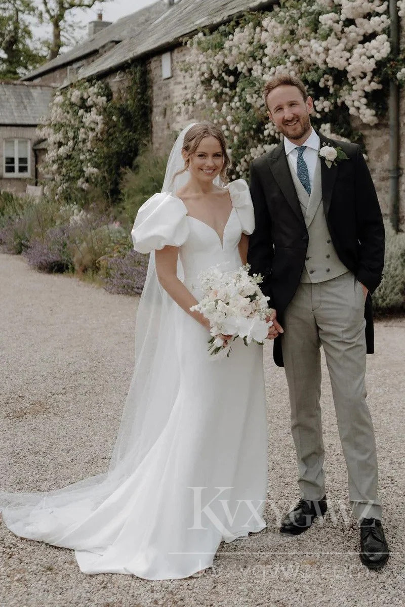 Chic Satin V-Neck Puff Sleeves Wedding Dress Sweep Train Bridal Gown HS431