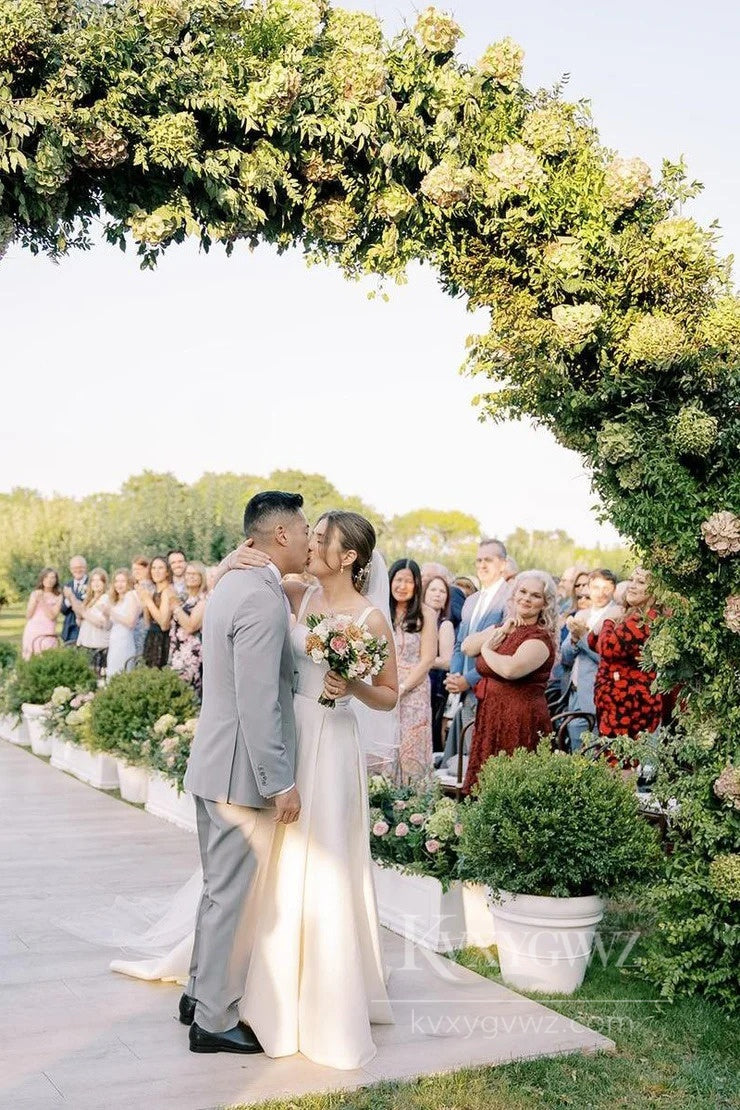 This timeless satin wedding gown features delicate spaghetti straps and a sleek A-line silhouette, creating an effortlessly elegant look for the bride. The minimalistic design with a smooth, lustrous finish allows the bride to shine while embracing a chic and contemporary style. Perfect for a romantic outdoor ceremony, the gown's soft drape complements a relaxed yet sophisticated vibe. Paired with a beautiful garden setting, this gown offers a modern take on classic bridal elegance. Ideal for brides seeking both simplicity and grace on their special day.