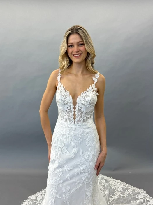 Deep V Neck Sweep Train Lace Wedding Gown/Dress With Appliques HS406
