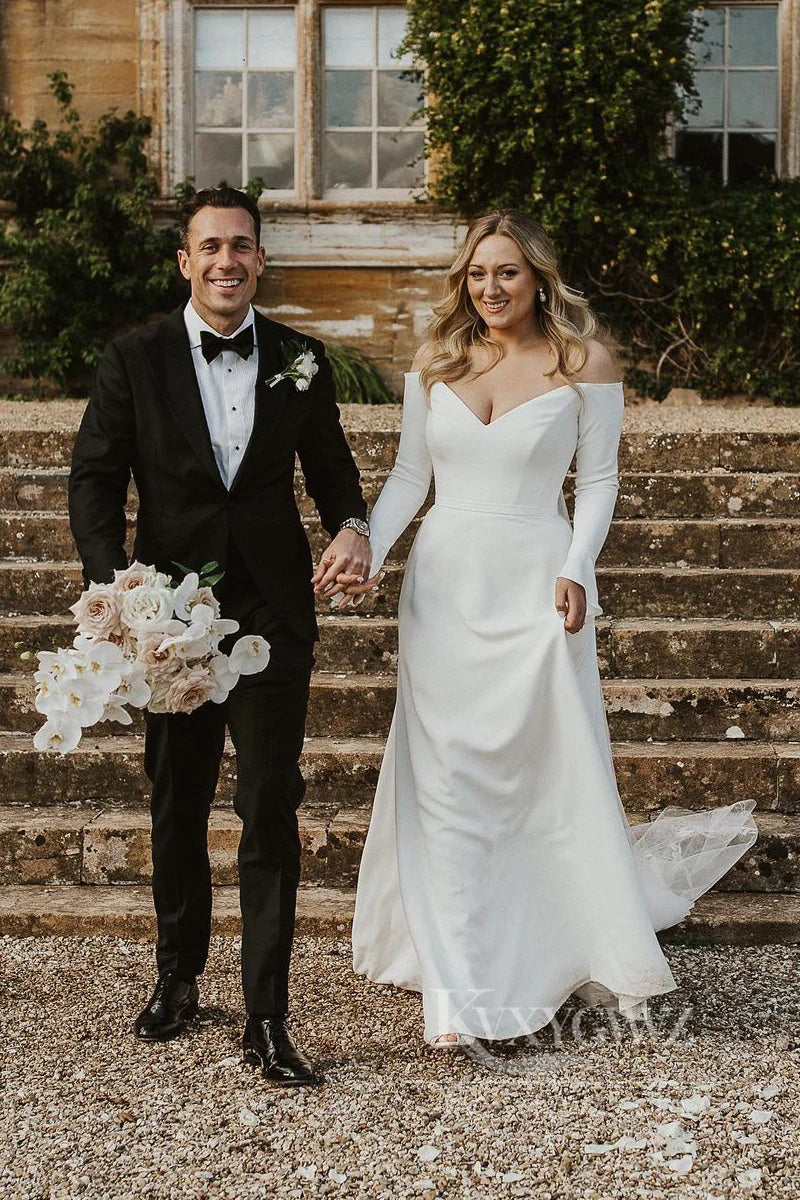 This luxurious satin wedding gown combines classic sophistication with modern elegance. Featuring an off-the-shoulder design, long sleeves, and a flattering V-neckline, this gown offers timeless beauty with a contemporary twist. The satin fabric adds a soft sheen, perfectly complementing the smooth lines of the dress. Ideal for a chic and stylish bride, this gown is perfect for a formal wedding or a high-end celebration. The intricate simplicity and graceful silhouette make it a statement piece that speaks volumes of effortless beauty.