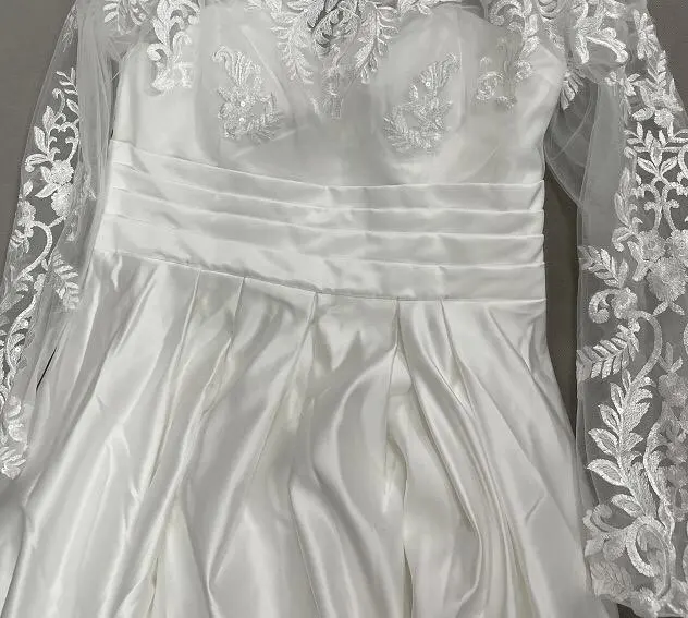 Elegance meets timeless beauty in this satin wedding gown, featuring long lace sleeves and a sweetheart neckline. The fitted bodice flows into a voluminous pleated skirt, creating a sophisticated, regal silhouette perfect for any bride. The intricate lace detailing adds a delicate, romantic touch, while the satin fabric provides a soft, luxurious sheen. Ideal for a classic, formal wedding, this gown combines modern grace with vintage charm, making it a stunning choice for brides seeking a timeless bridal look."