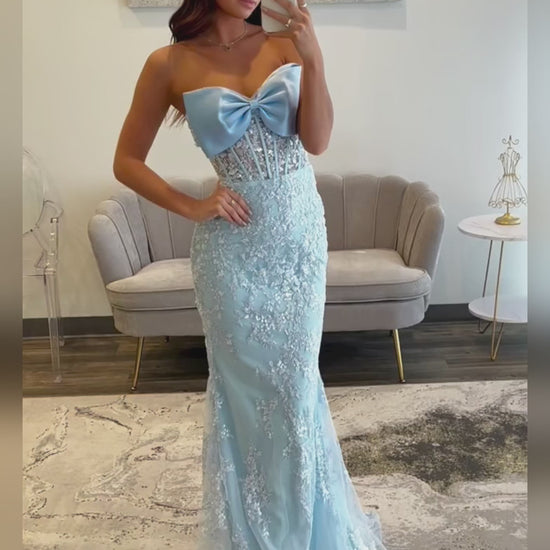 Floral Mermaid Sky Blue Strapless Long Prom Dress with Bow LF168