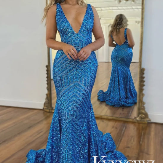 Head-to-toe sparkle: a plunging V-neck mermaid evening gown featuring an all-over sequin-embroidered lace overlay and a sculpted fit-and-flare silhouette for maximum drama. Perfect for black-tie galas, red-carpet moments, prom night, or a statement wedding-guest look—pin this to your eveningwear or editorial mood board for Old-Hollywood glamour with modern shine.