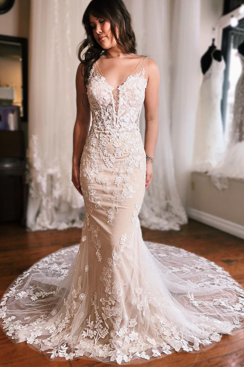 Graceful Mermaid V Neck Tulle Lace Wedding Dresses Gown HS947