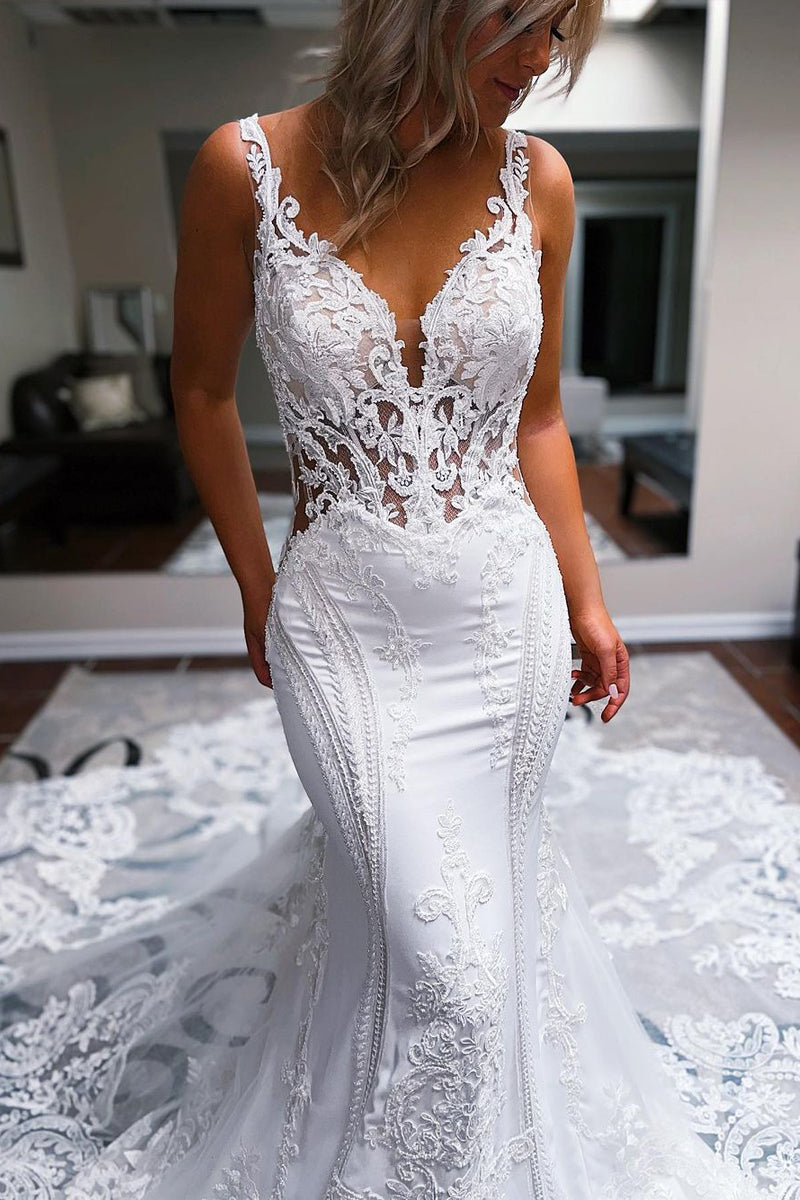 Graceful Mermaid V Neck White Lace Wedding Dresses Gown with Train HS971