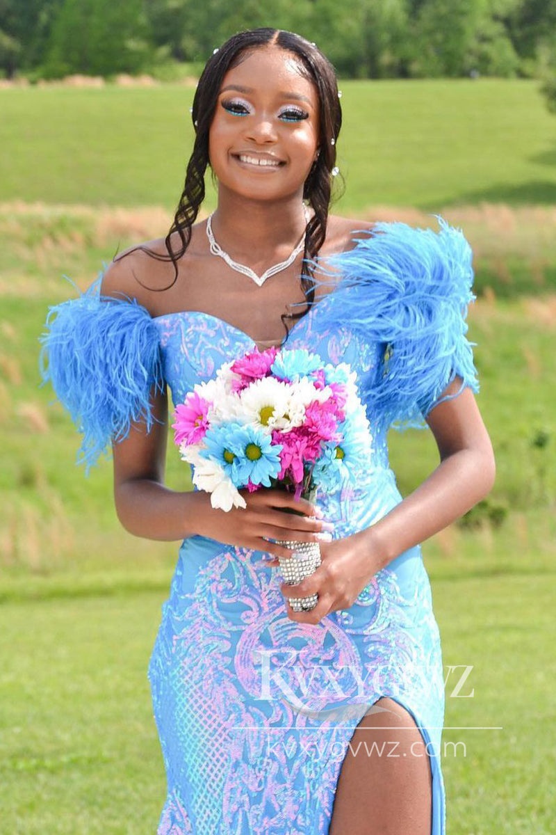 Lavender Mermaid V Neck Prom Gown Sequin Lace Long Prom Evening Dress with Feather LF792