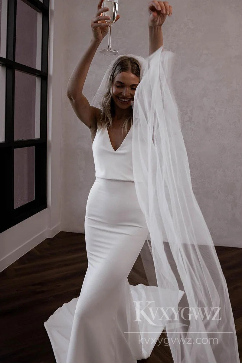 Turn heads in this elegant satin deep-V mermaid wedding gown. With its luxurious satin fabric that perfectly contours the body, this dress offers a flattering silhouette with a contemporary twist. The dramatic deep V-neckline adds a touch of daring allure, while the flowing train creates a stunning finish. Paired with a sheer veil for an extra dose of bridal sophistication, this gown blends modern minimalism with timeless bridal beauty—ideal for brides who want a sleek, chic, and effortlessly glamorous look on their big day.