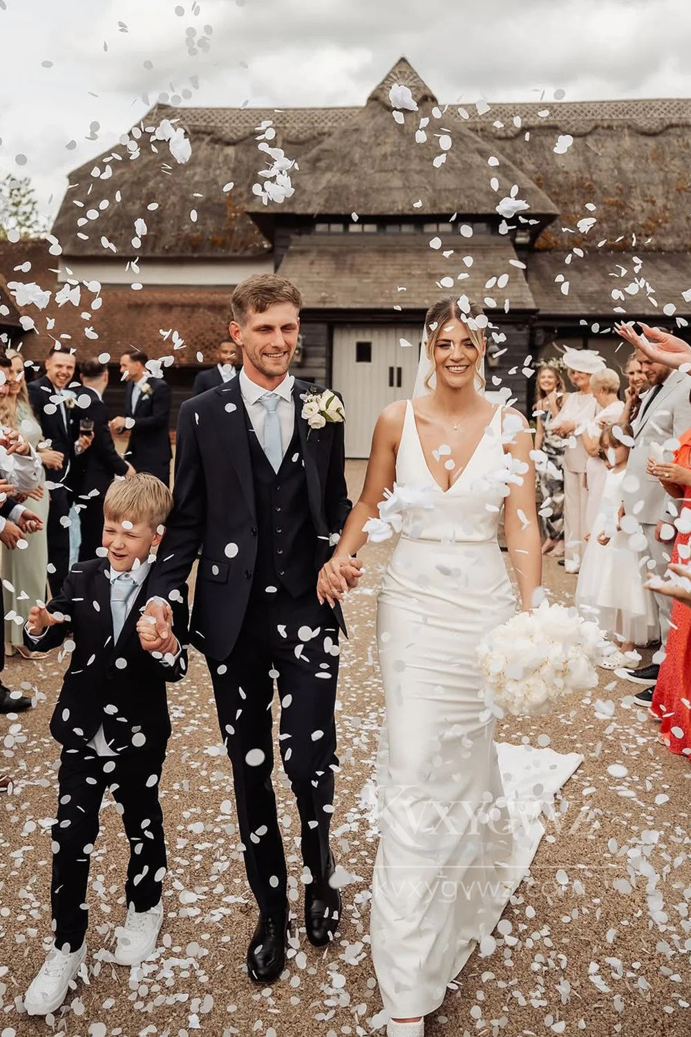 This chic satin mermaid wedding dress features a flattering V-neckline and clean lines that emphasize a sleek silhouette. The figure-hugging fit extends into a dramatic flare at the bottom, creating a stunning mermaid shape. Perfect for modern brides seeking a minimalist yet glamorous look, the elegant fabric drapes beautifully while maintaining structure. Ideal for both intimate and grand weddings, this gown exudes timeless beauty and sophistication.