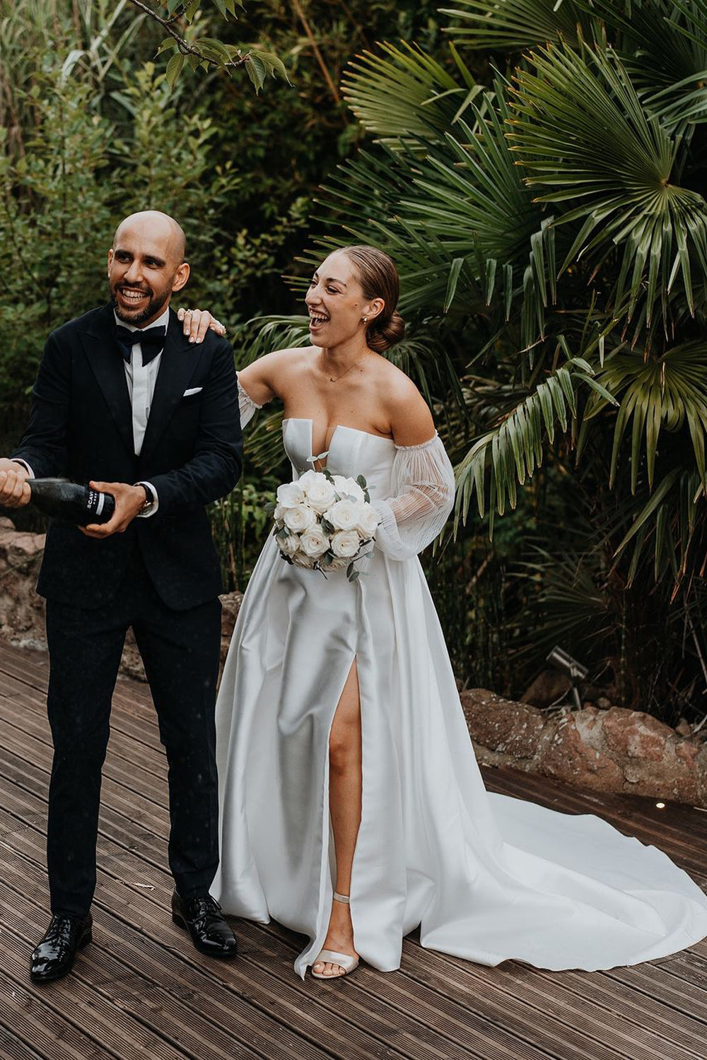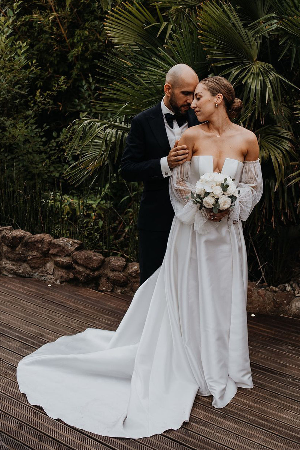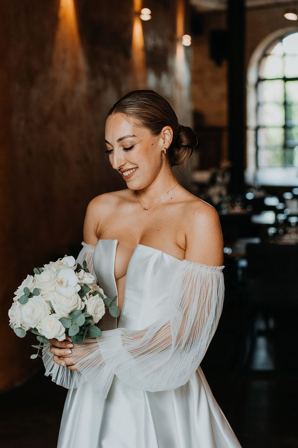 Pastoral Style A Line V Neck Satin Long Wedding Dresses Gown with Sleeves HS960