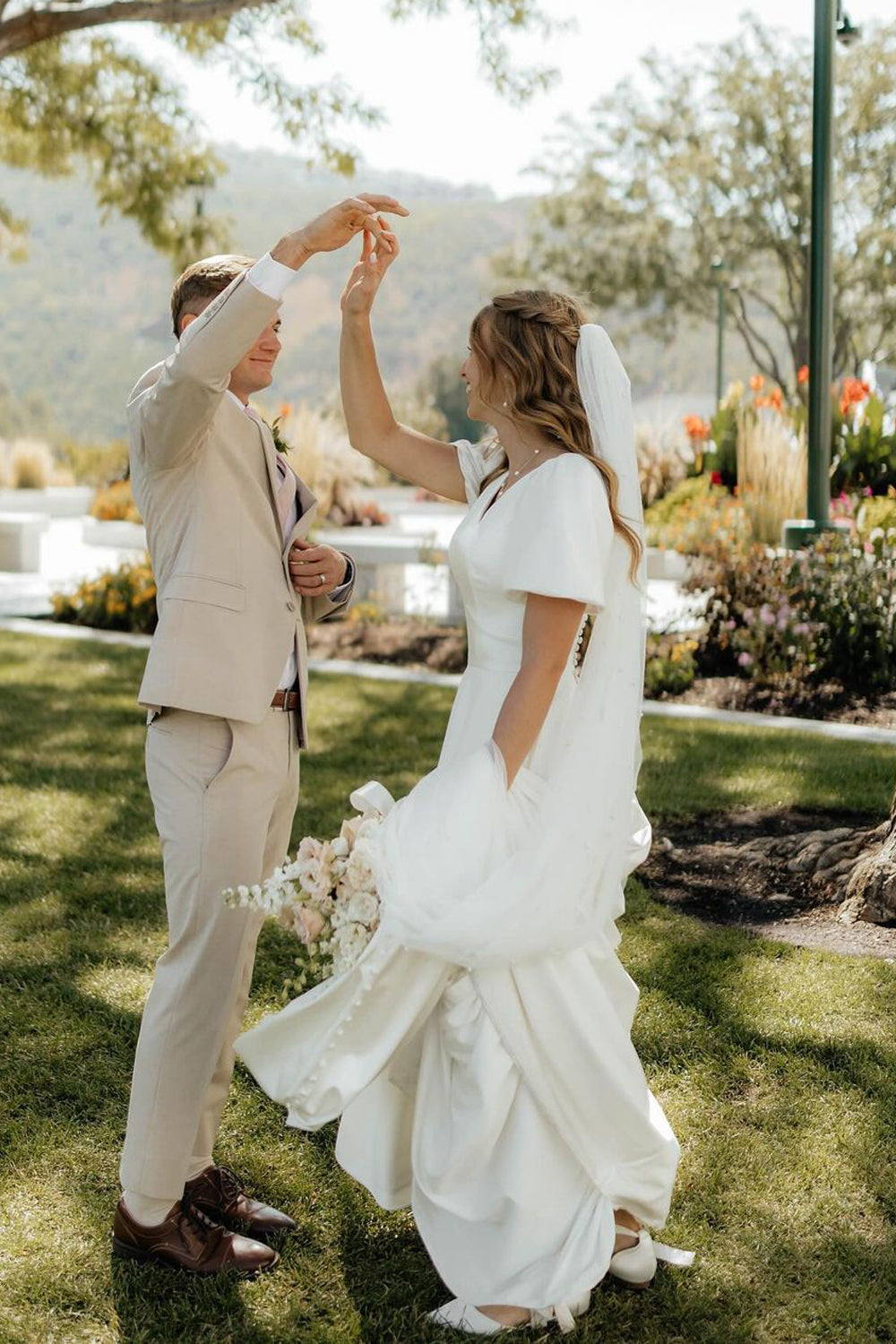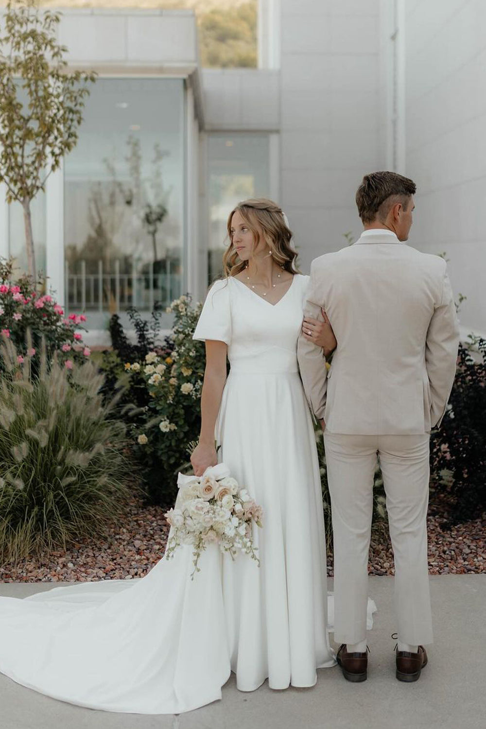 Pastoral Style A Line V Neck Satin Wedding Dresses Gown with Sleeves HS989
