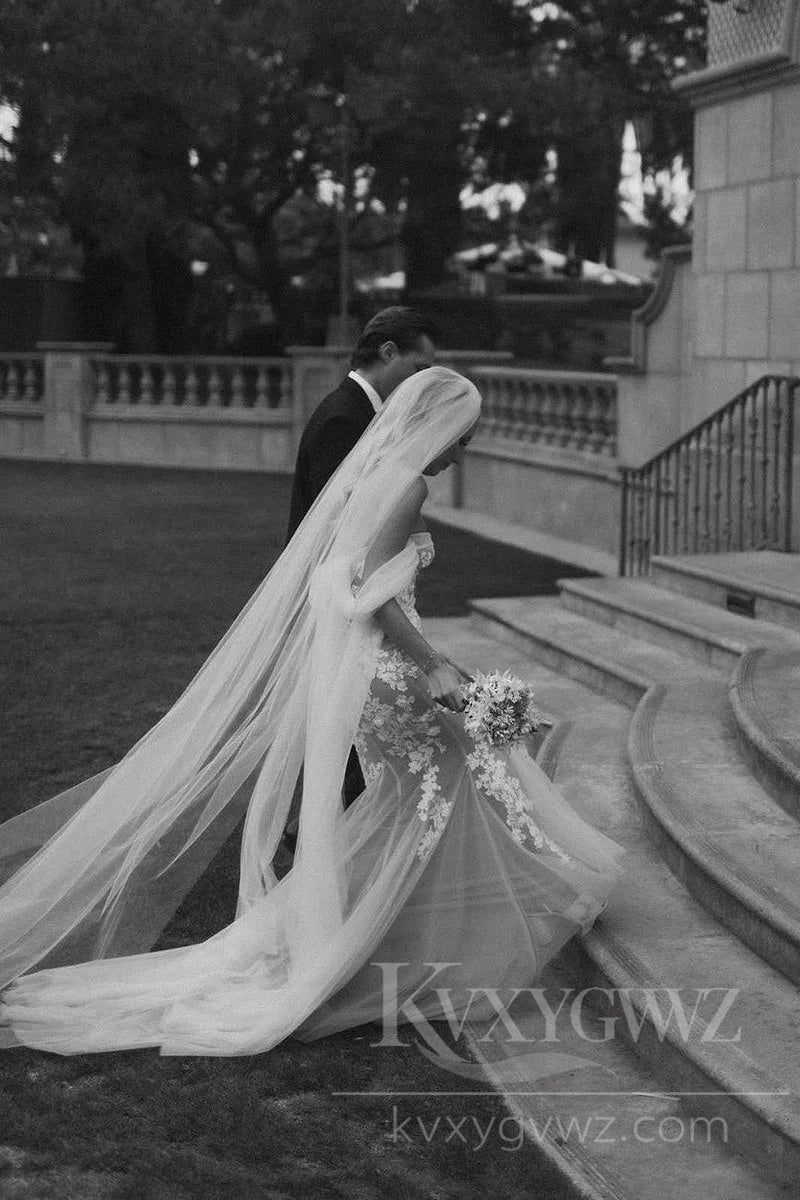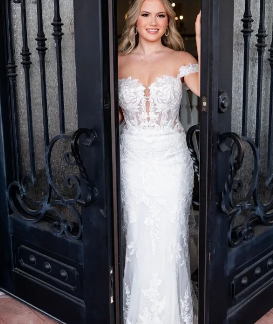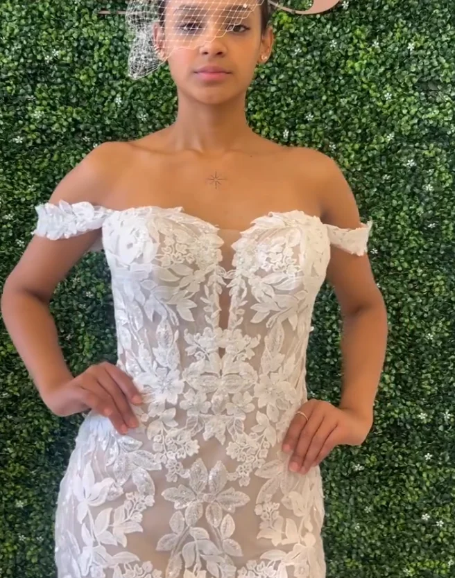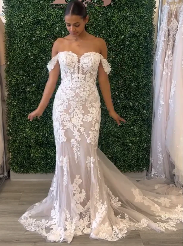 Step into a dream with this stunning off-shoulder lace wedding gown adorned with delicate floral appliqué. The soft, sheer fabric and intricate floral details add a touch of elegance and romance to the fitted silhouette. The flowing train creates a dramatic yet graceful look, perfect for brides seeking sophistication and timeless beauty. Ideal for an indoor or outdoor ceremony, this dress brings modern allure to classic bridal style, with just the right balance of glamour and elegance.