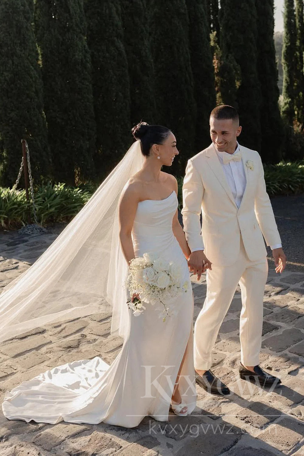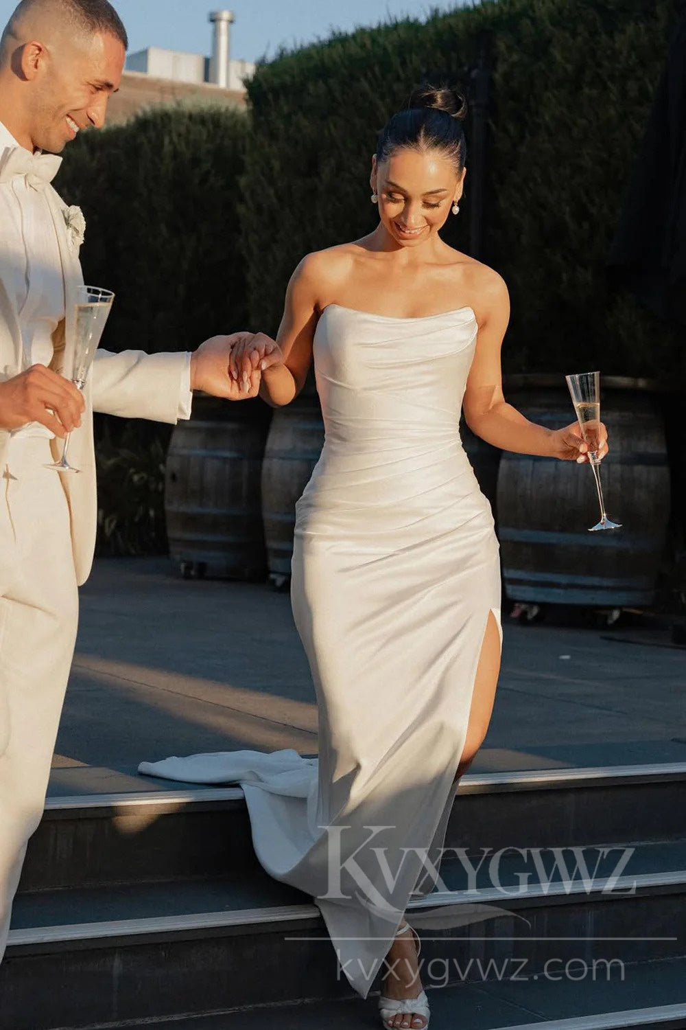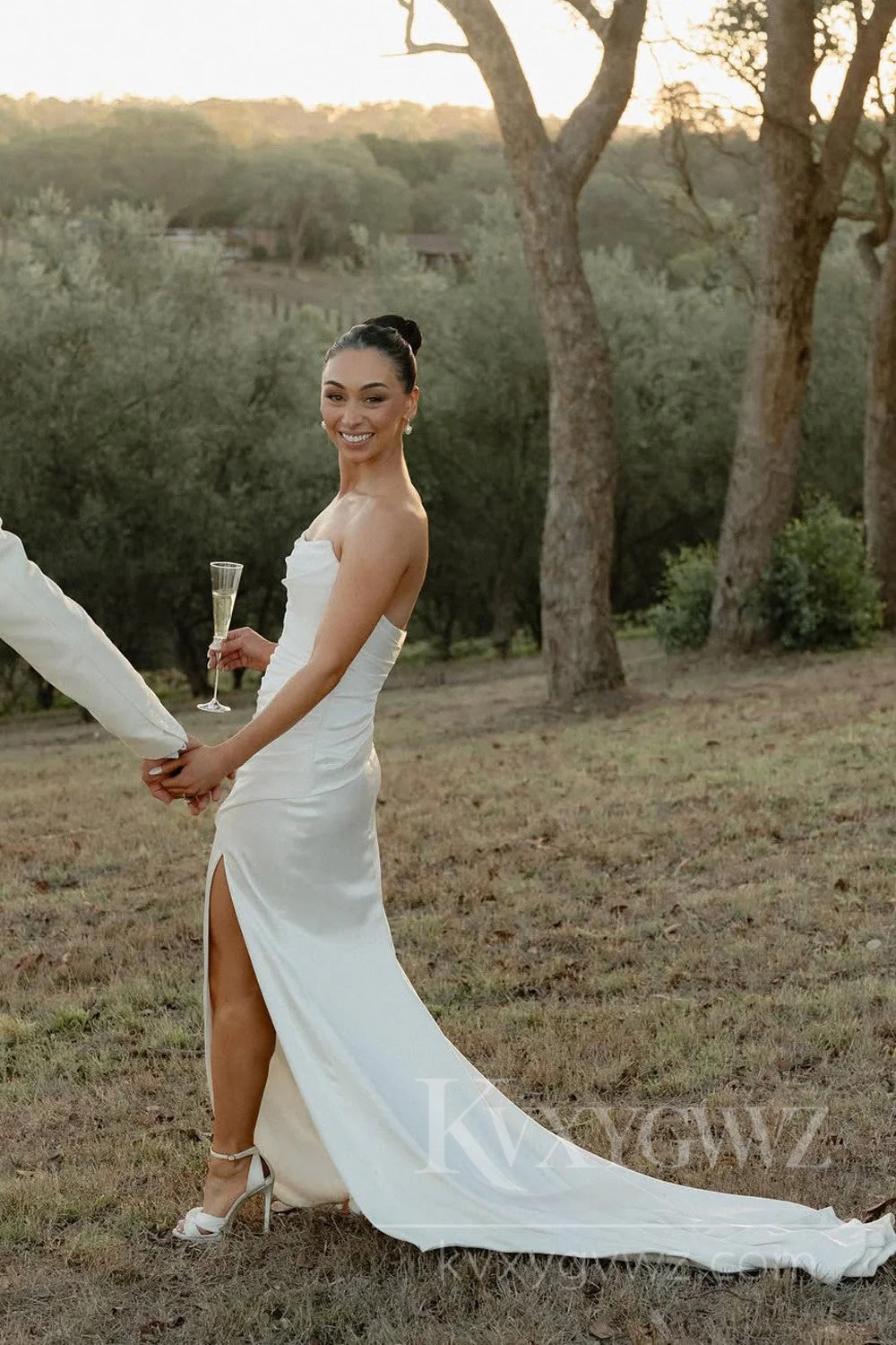 Sleek Satin Strapless Mermaid Wedding Dress with High Slit Bridal Gown HS456