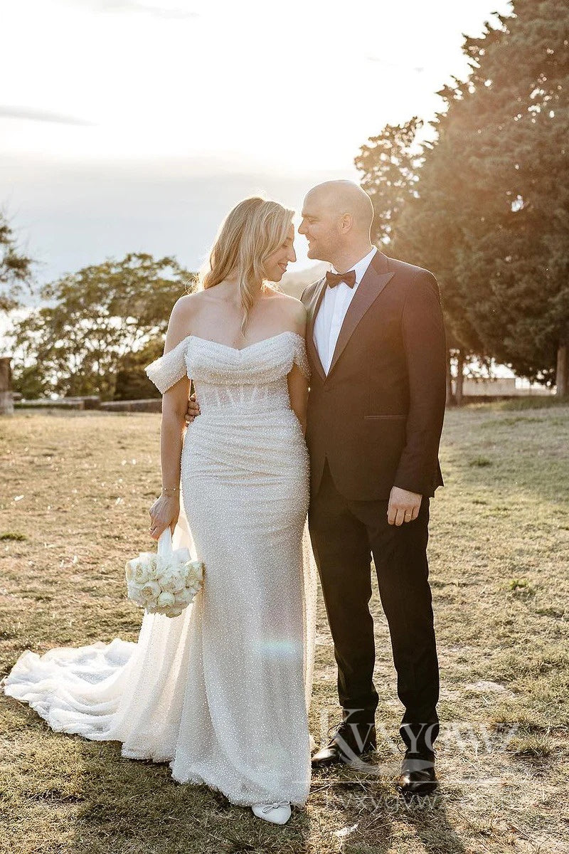 Add a touch of glamour to your big day with this stunning off-shoulder mermaid wedding dress. Crafted from sparkling fabric that glistens with every step, this dress is perfect for the bride who wants to shine. The delicate beaded detailing adds a subtle yet captivating effect, while the mermaid silhouette emphasizes your curves beautifully. Whether you're walking down the aisle or dancing the night away, this dress will make you feel like a star.
