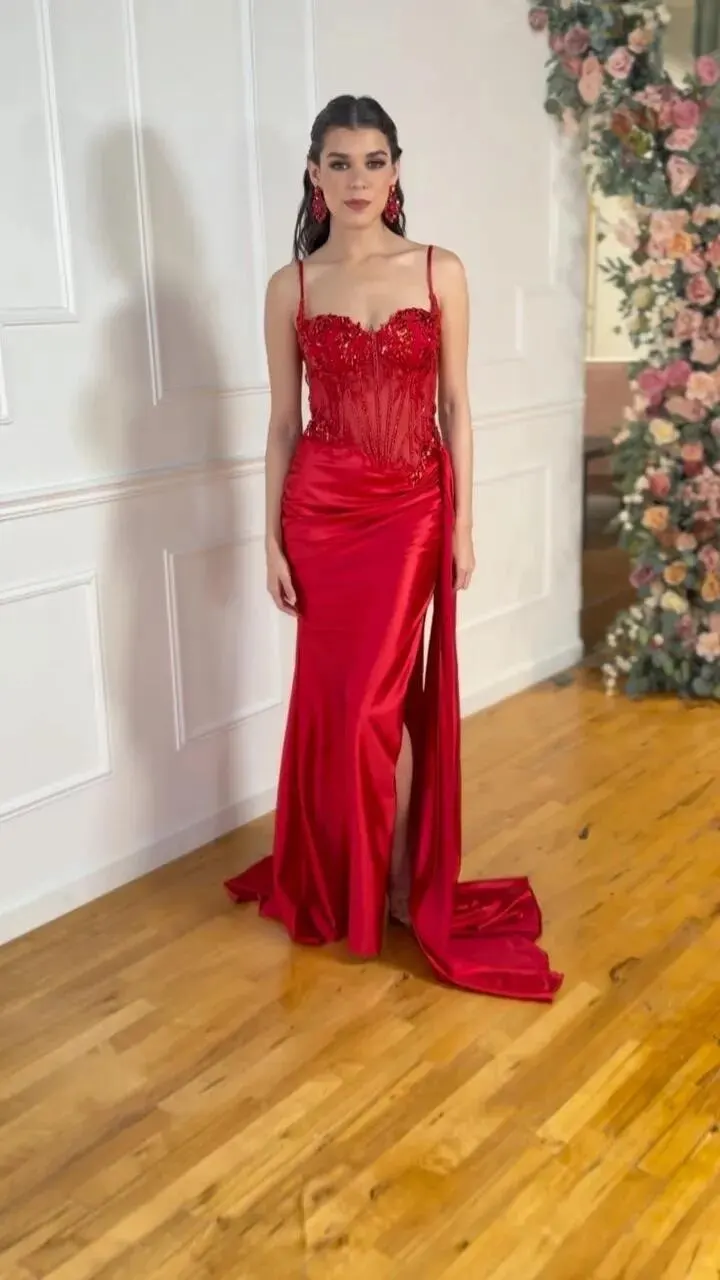 A modern, figure-flattering sheath evening gown crafted on a sheer tulle overlay with delicate lace appliqué and intricate hand-beading. The design features slender spaghetti straps, a softly defined waist and a flattering thigh-high slit that adds movement and on-camera drama—ideal for prom, red-carpet events, evening galas, and bridal-party looks. Pin this for inspo when you want a balance of couture detail and clean, wearable silhouette: structured bodice, sparkling texture, and photo-ready simplicity.