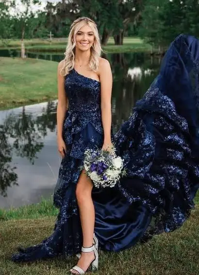 Sparkly Lilac One Shoulder Tiered Lace Long Prom Dress with Slit LF014