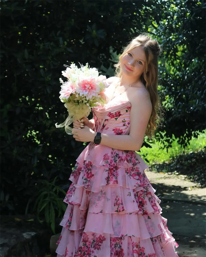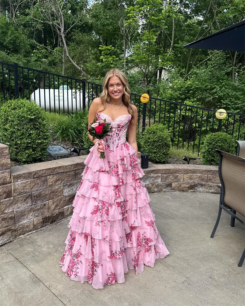 Step into a fairytale with this breathtaking tiered evening gown, where hand-layered organza ruffles dance over a cinched corset bodice adorned with botanical floral prints. The sweetheart neckline and flowing silhouette create timeless romance perfect for making grand entrances.
